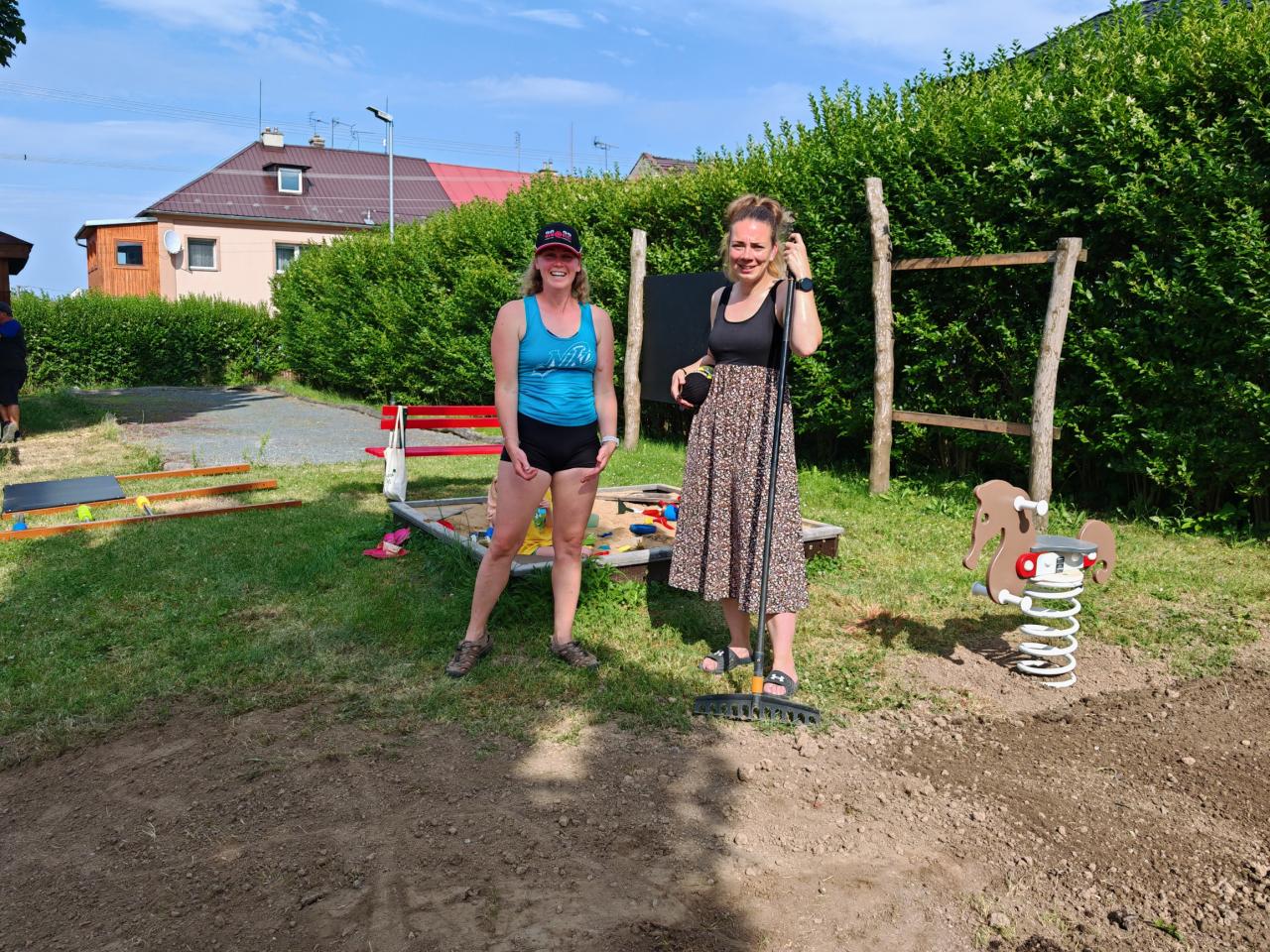 Dětské hřiště, které se budovalo s pomocí dobrovolníků, je téměř hotové. Velké poděkování patří brigádníkům, kteří ve čtvrtek 26. června pomohli s posledními úpravami terénu. Některé herní prvky jsou již nyní k dispozici a od 5. července bude hřiště otevřeno pro všechny děti.