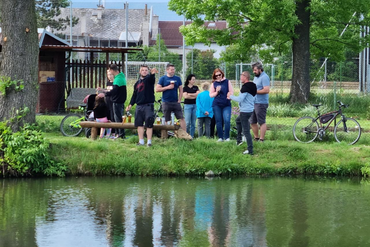 Odpolední rybářské závody na rybníku za bytovkami.